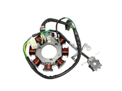 Forma parte del generador o alternador de la motocicleta allí se encuentran alojadas las bobinas que alimentan los diferentes circuitos eléctricos (encendido lucescarga etc)