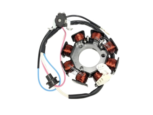 Forma parte del generador o alternador de la motocicleta allí se encuentran alojadas las bobinas que alimentan los diferentes circuitos eléctricos (encendido lucescarga etc)